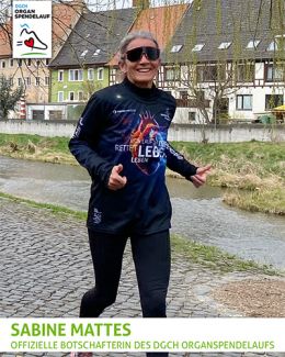 Sabine Mattes ist ambitionierte Läuferin und Ausdauersportlerin. Ehrenamtlich ist sie als Jugendkoordinator und Trainer einer Handballspielgemeinschaft tätig. Als offizielle Botschafterin des Organspendelaufs unterstützt uns Sabine bereits seit 2021. Wir sagen herzlichen Dank!