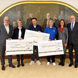 Die Spenden des Corza Medical Organspendelaufs 2023 gingen an die Kinderhilfe Organtransplantation, den Verein Junge Helden e.V., sowie das Rehazentrum Ederhof der Rudolf Pichlmayr-Stiftung. Übergeben wurden die symbolischen Spendeschecks von Prof. Dr. Matthias Anthuber (1.v.l.), Chirurgischer Leiter des Transplantationszentrums am Universitätsklinikum Augsburg und Beauftragter von Seiten der DGCH für den Organspendelauf, sowie Christiane Bruns, Präsidentin der der DGCH (5.v.l.).
