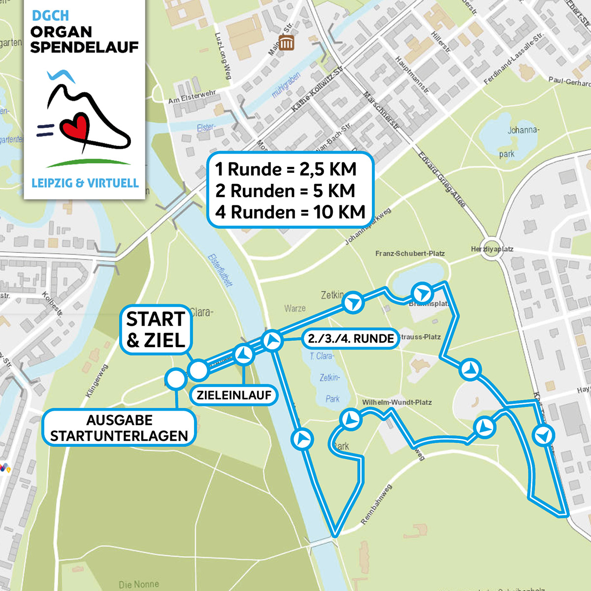 Der Präsenzlauf des DGCH Organspendelaufs 2026 findet in Leipzig statt. Start & Ziel sowie Streckenverlauf sind im Clara-Zetkin-Park in der Anton-Bruckner-Allee auf Höhe der BSV AOK Leipzig.